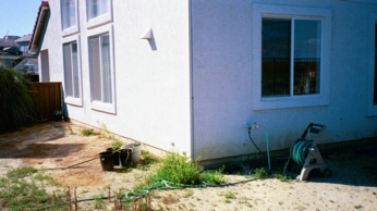 This is a focal point on the sunny south side of the house. In the after shot is the Phoenix roebelenii or Pygmy date palm. In the drawing above, it is supposed to be 6 feet tall, although it doesn't look it (our eye level here and in most shots is at 5 feet). The short fence that divides the back yard from the front yard is heightened in the after shot by a trellis and blooming jasmine. Besides our pampas grass being green instead of the brown (the only choice in the software), our balcony rails are white, but rails of the correct type were only available in unpainted wood with no option to change the color.