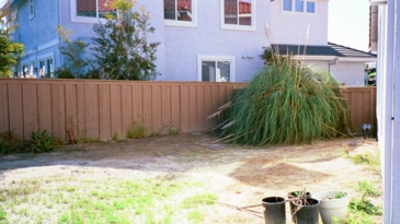 In the after shot you can see our trees. The two outer ones are Cupaniopsis anacardioides (Carrotwood), and the inner one is a Podocarpus gracilior. These are evergreen trees and will not change much throughout the year. What is not depicted here is that just behind the fence is another house with second story windows facing our yard, from which these trees will provide some privacy. The pampas grass on the right of the picture is really green, not brown as shown. A trellis with blooming jasmine heightens the low fence.